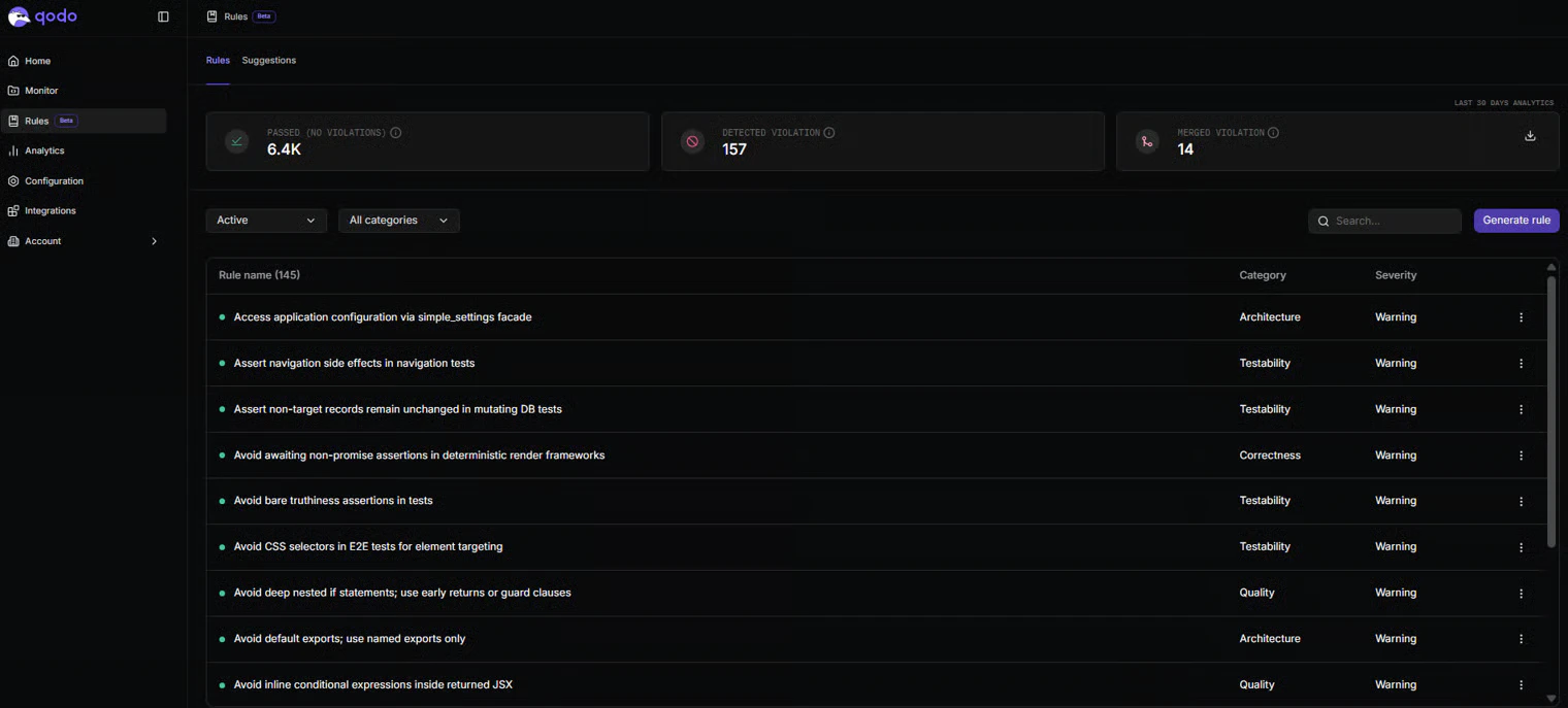 - Suggestions — review and activate proposed rules generated from real code and PR history