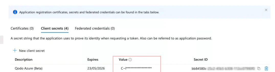 b. Click Add to generate a client secret and save the Value. This will not be visible later.\