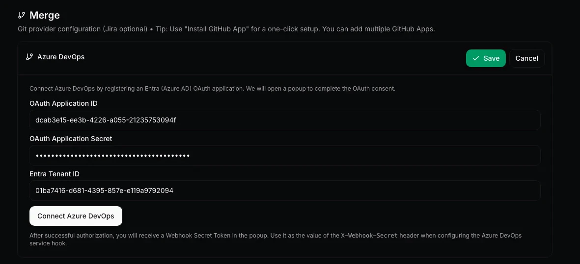 To install Qodo on Azure DevOps you need:- A single-tenant Qodo environment configured for Azure DevOps, including the Qodo webhook endpoint, provided by Qodo. Azure connection details (tenant ID, client ID, and client secret) are generated as part of the Microsoft Entra ID application registration during setup. Multi-tenant customers should contact Qodo to discuss the appropriate configuration.