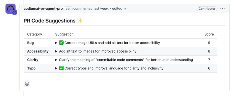 Upon confirming that a suggestion was implemented, Qodo automatically adds a ✅ (check mark) to the relevant suggestion, enabling transparent tracking of Qodo's impact analysis.