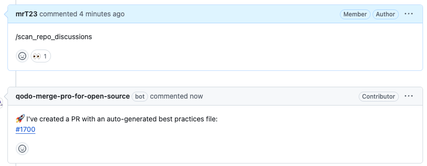 /scan_repo_discussions --scan_repo_discussions.force_scan=true/scan_repo_discussions --scan_repo_discussions.days_back=X # Default is 365/scan_repo_discussions --scan_repo_discussions.minimal_number_of_prs=X # Default is 50