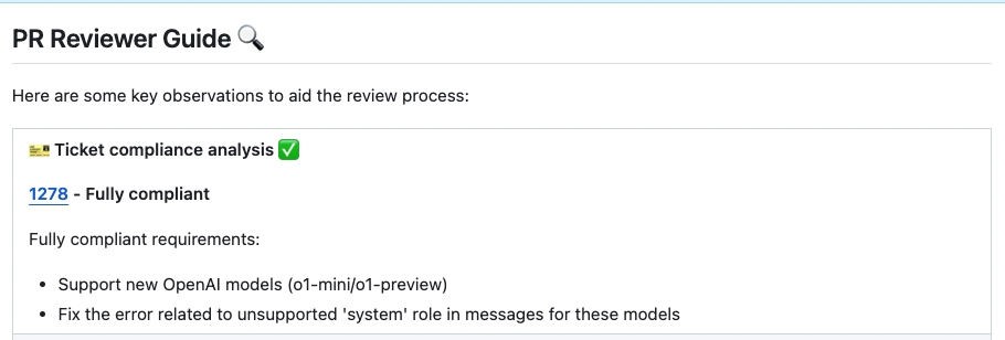 The review tool also incorporates ticket context into its analysis. Additionally, it evaluates whether the PR aligns with the ticket’s intent, assigning one of the following labels: