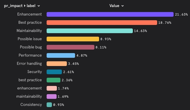 Explanation: This chart illustrates the distribution of implemented suggestions across different categories, enabling teams to better understand Qodo Merge's impact on various aspects of code quality and development practices.