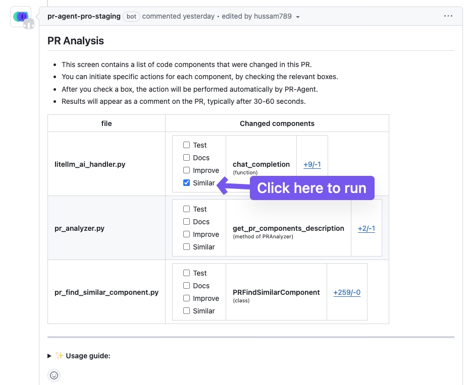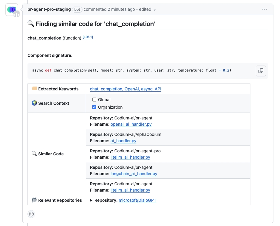 The similar code tool retrieves the most similar code components from inside the organization's codebase, or from open-source code.