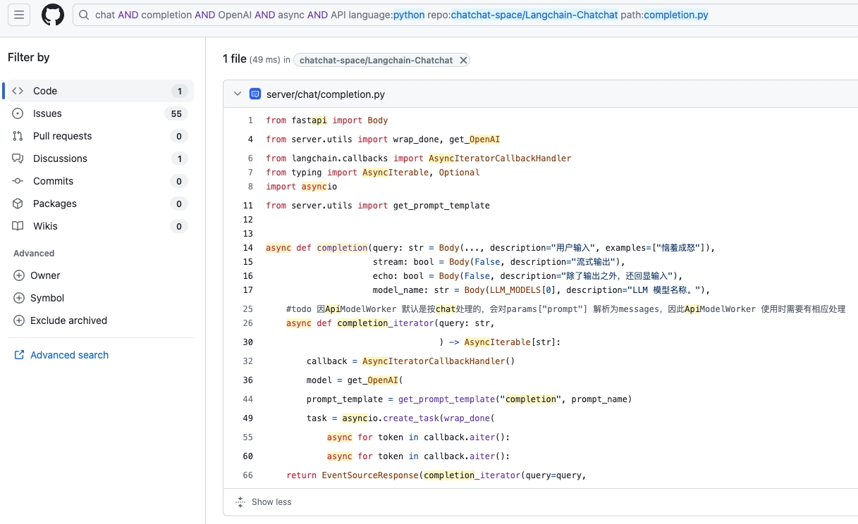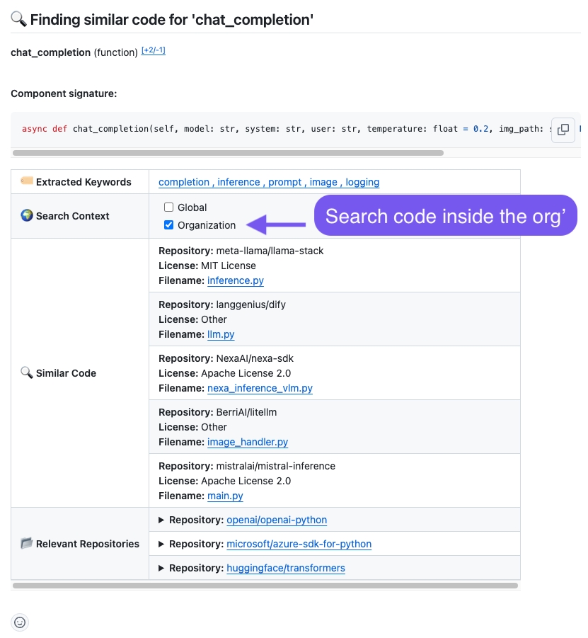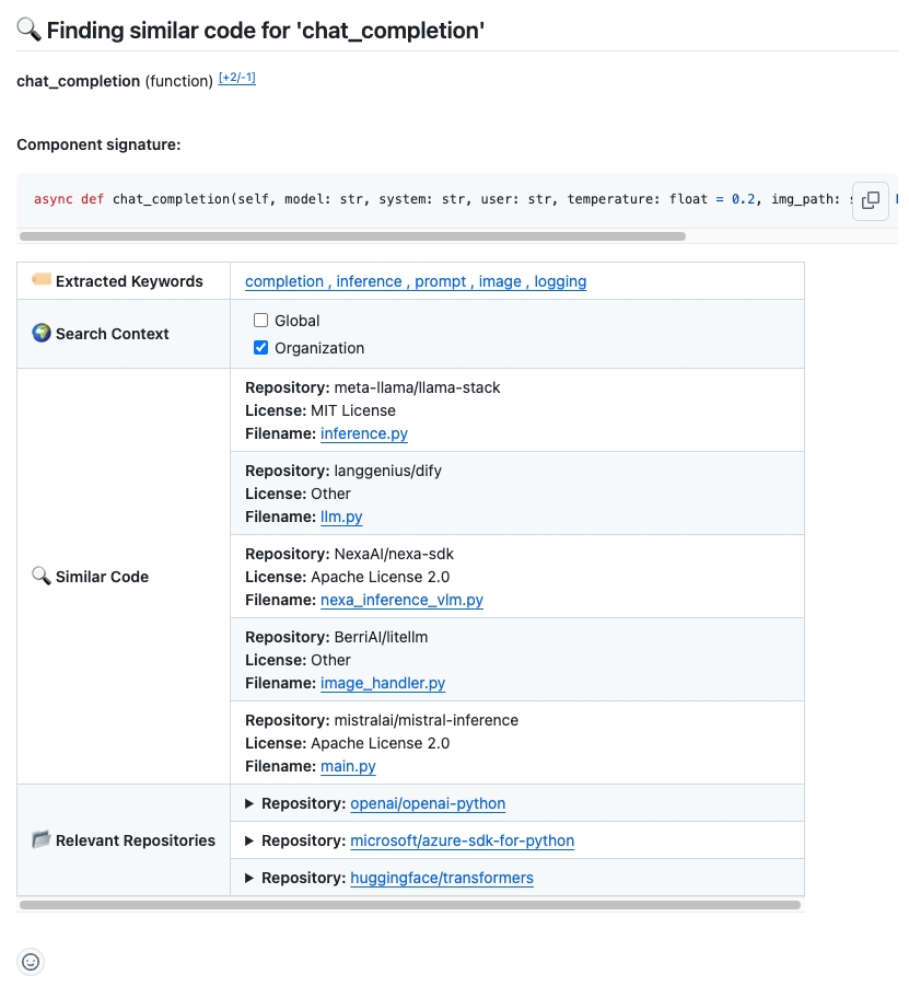 You can search for similar code within your organization’s codebase or globally, across open-source projects. Each result includes the matching code and its license information.