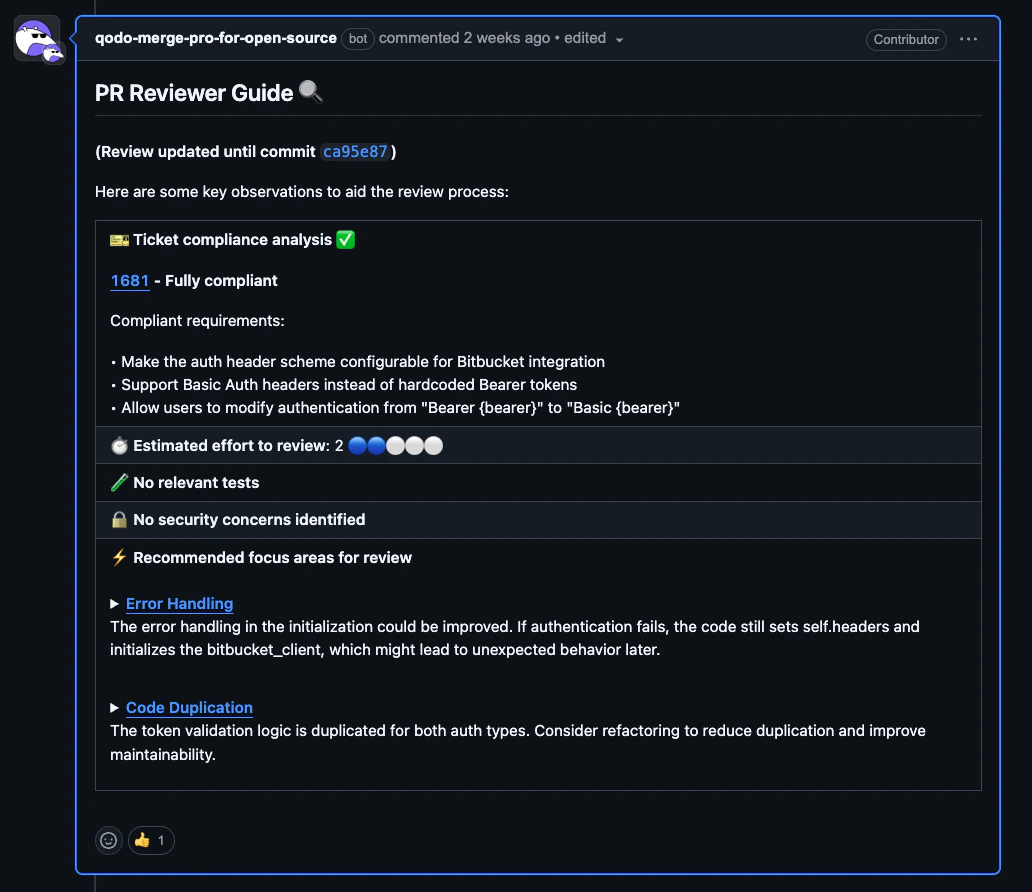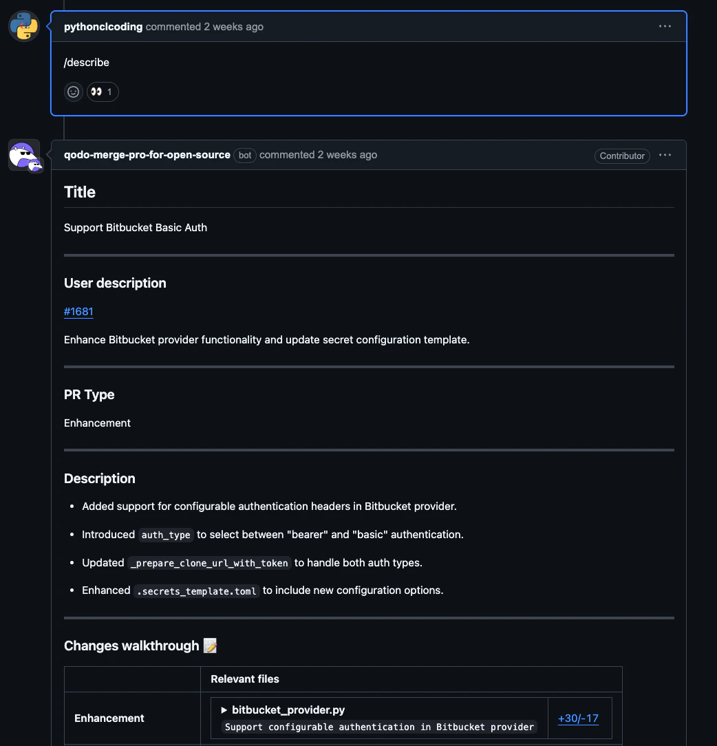 Just comment on any pull request with a command like:The Qodo bot will react with an 👀 emoji to indicate it has received your comment. This method of using Qodo works immediately after setup.