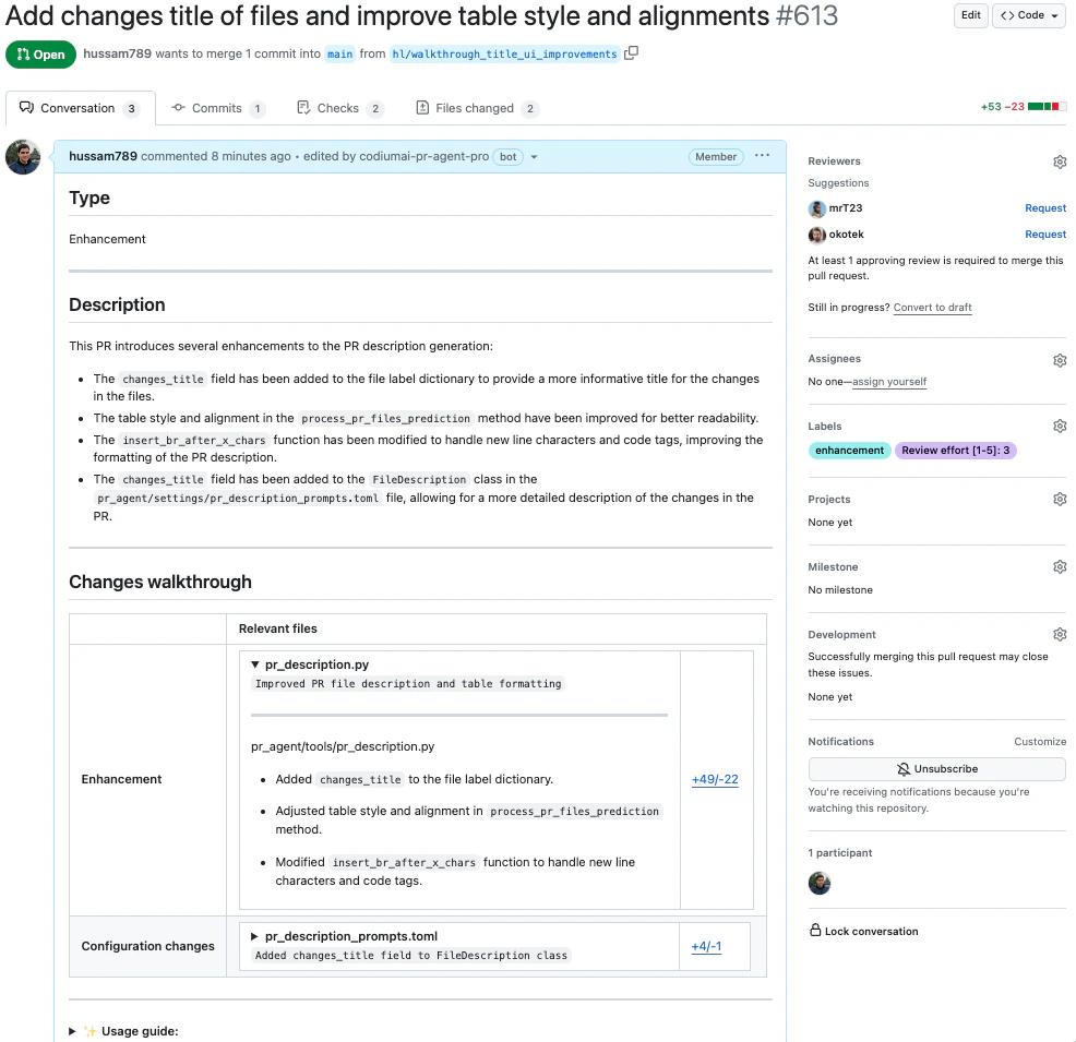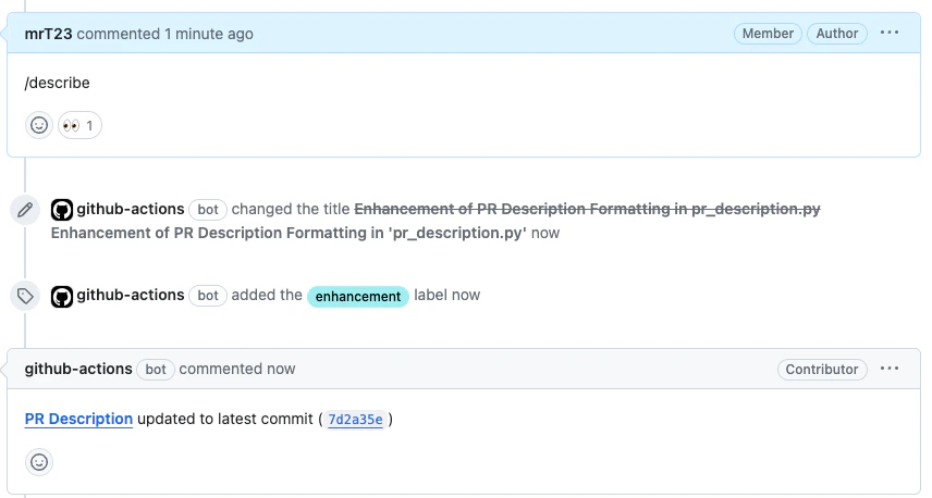 describe tool scans the PR code changes, and generates a full PR description: title, type, summary, a walkthrough of the changes made in the PR, and suggested labels.