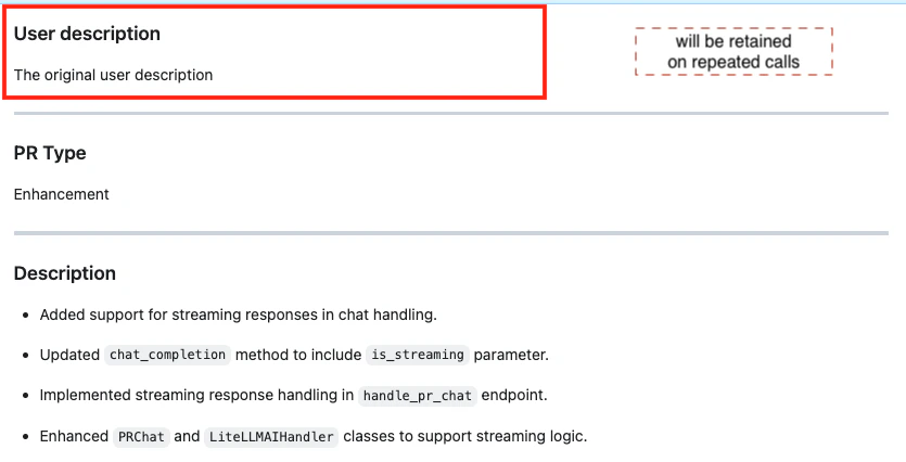 You can define exactly where each part of the generated description should appear using markers. For example, if the PR’s original description was:pr_agent: placeholders with the relevant content.