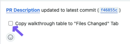 table: A summary table will be displayed at the top of “Files changed” tab.true: Adds a comment to each file with a short summary.false(default): File changes walkthrough will appear only in the main PR description (the “Conversations” tab).
