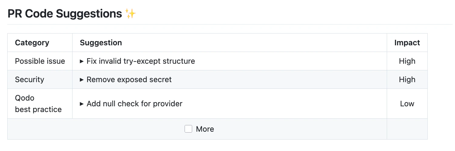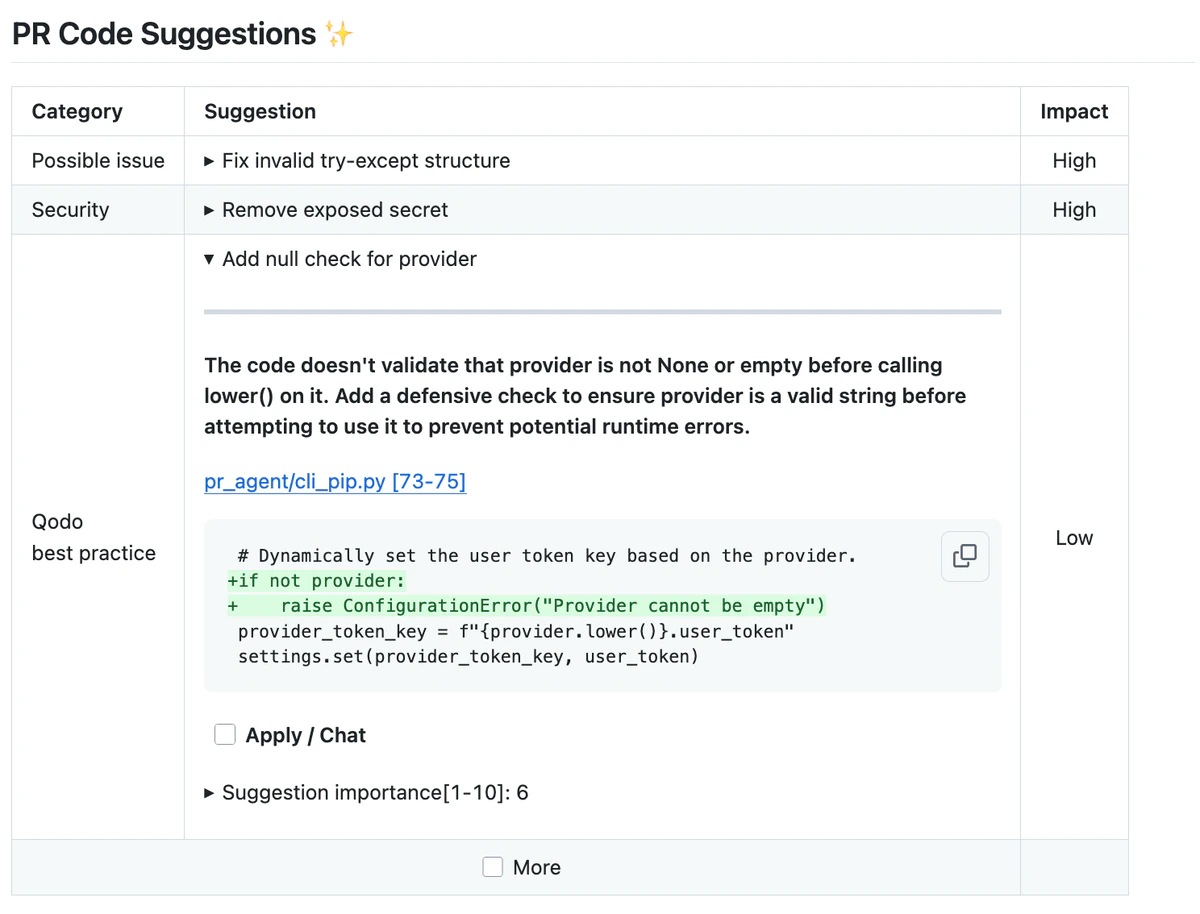 Extra instructions are important. Theimprove tool can be configured with extra instructions, which can be used to guide Qodo to a feedback tailored to the needs of your project.