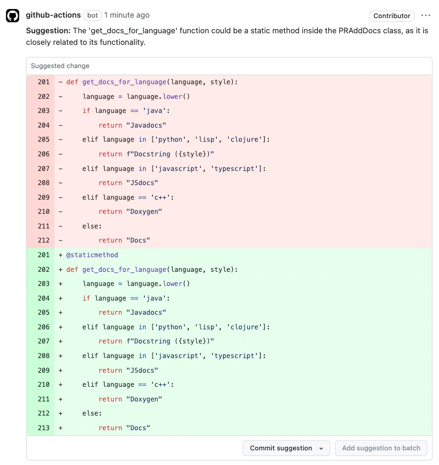 - Apply this suggestion** button**: Clicking this checkbox instantly converts a suggestion into a committable code change. When committed to the PR, changes made to code that was flagged for improvement will be marked with a check mark, allowing developers to easily track and review implemented recommendations.