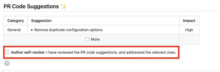 - Author self-review** button**: Interactive acknowledgment that developers have opened and reviewed collapsed suggestions