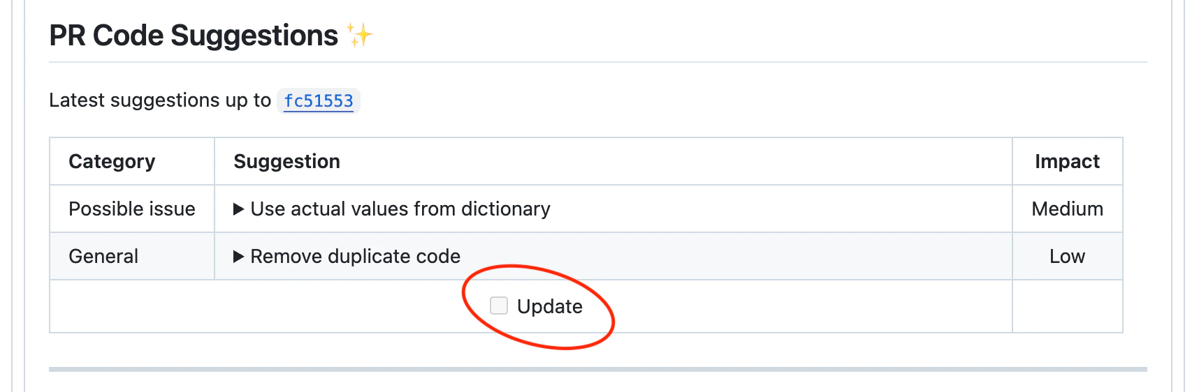 When new commits are pushed after a recent code suggestions report on a pull request, an Update button appears (as shown below). Clicking this button triggers the/improve tool, which: